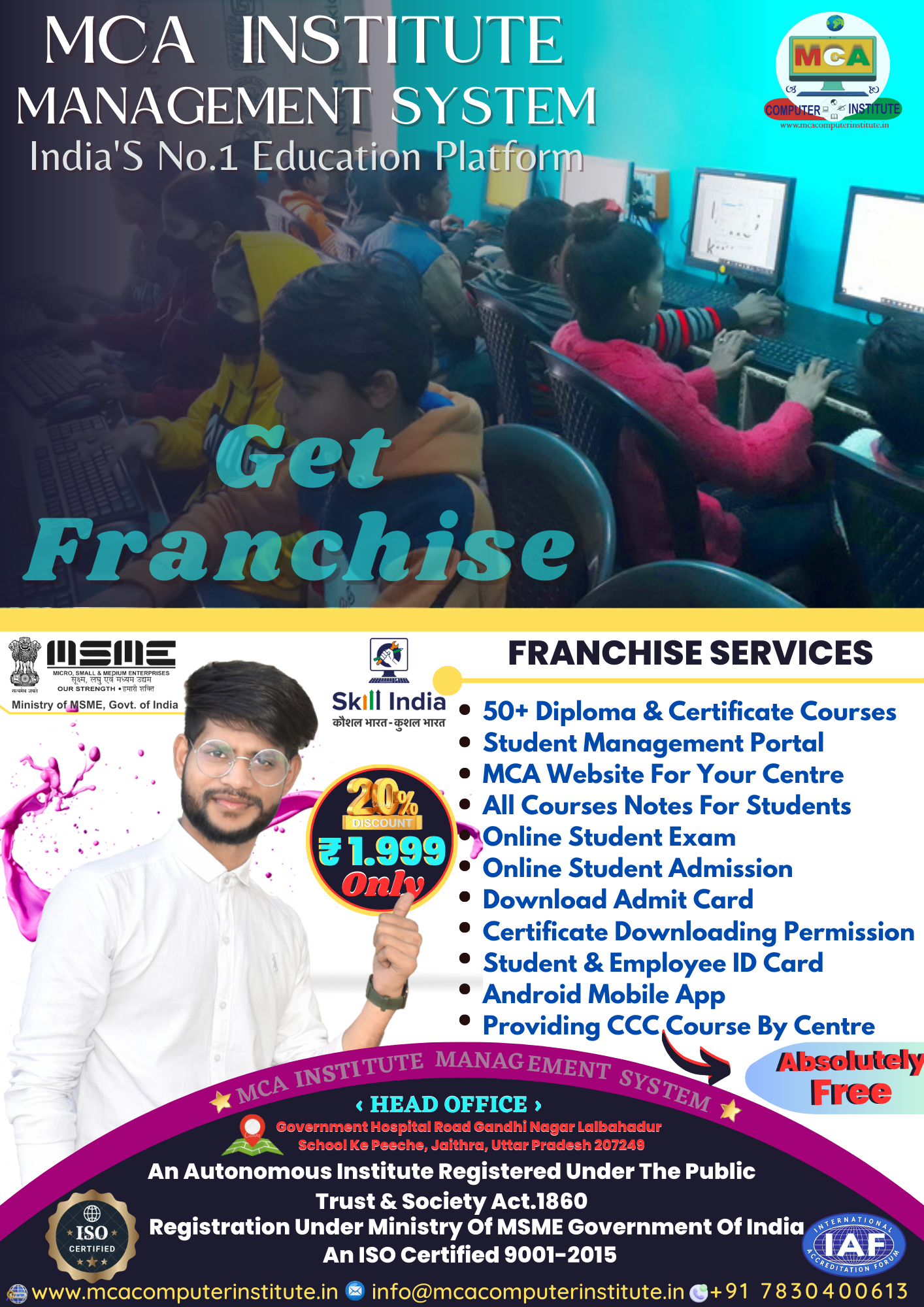 नमस्ते सर/मैडम आप बहुत ही अच्छी प्लेटफार्म पर आए हैं जहां पर आपको हमारे द्वारा सेंटर खोलने की मान्यता दी जाती है आप किसी भी गांव शहर में सेंटर खोलना चाहते हैं तो आप बहुत ही अच्छी जगह पर आ चुके हैं आपके लिए हमारे पास फ्रेंचाइजी और खुद का सेंटर खोलने के लिए मान्यता दी जाती है जिसके बाद आप अपना सेंटर कहीं भी किसी भी जगअच्छे से चला सकते हैं सर हम आपको दो प्रकार की सेंटर खोलने की मान्यता देते हैं जैसे अगर आप हमारे द्वारा सेंटर चलाना चाहते हैं तो आपको एम.सी.एक फ्रेंचाइजी दी जाएगी जिसके द्वारा आपको बहुत ही कम क़ीमत में आपकोफ्रेंचाइजी दी जाएगी और आप अपने इस्टीट्यूट को अच्छे से चला सकते हैं लेकिन अगर आप खुद का इंस्टिट्यूट खोलना चाहते हैं जिसमें आपको हमारे द्वारा सेंटर लिंक करके नहीं चलाना तो उस लिए भी आपको हम व्हाइट लेबल नाम की एक विशेष अधिकार देते हैं जिसमें आप अपना खुद का सेंटर खोलकर उसे चला सकते हैं जिसके बाद आपका खुद का सेंटर खुद के नाम से चलेगा जो भी नाम आप अपने सेंटर को देना चाहते हैं और आप भी किसी भी व्यक्ति को फ्रेंचाइजी देकर उसे अपने द्वारा सेंटर खुलवा सकते हैं सर इसमें हम आपको हर प्रकार की सर्विस देते रहते हैं सबसे बड़ी बात यह है कि आप सेंटर खोलना तो चाहते हैं लेकिन आपको आईडिया नहीं होता की सेंटर चलाना कैसे होता है और फ्रेंचाइजी लेने के बाद सेंर को किस तरह Grow करते हैं इन दोनों कामों के लिए हमारी टीम 24 घंटे आपके लिए आपकी सेवा में हाजिर रहती है जिसके बाद आपको Guide किया जाता है और यह बताया जाता है कि आपको अपने सेंटर में कौनसी सर्विस कैसे देनी है और कौन सा स्टेप फॉलो करना होता है बस हमारे सेंटर से आपको इसी प्रकार की सर्विस दी जाती है जिसके द्वारा आप अपने सेंटर को Grow कर सकते हैं और अच्छे से चला सकते हैं आपको हम हमेशा गाइड करने के लिए तैयार रहते हैं बस हमारे यहां से एम.सी.ए की फ्रेंचाइजी या व्हाइट लेबल फ्रेंचाइजी लेने से आपको इस टेंशन से फ्री हो जाना है की आप अपने सेंटर को किस तरह आगे तक ले जाएंगे और किस तरह इंस्टिट्यूट को पढ़ाएंगे आपको टीचिंग से लेकर यहां तक कि सेंटर को अच्छे से मेंटेन करने के लिए गाइड किया जाता है अगर आप हमारे सेंटर या हमारे White Label Franchise से जुड़ना चाहते हैं तो नीचे दिए गए लिंक पर क्लिक करें और अपना सेंटर खोले कहीं भी और किसी भी जगह