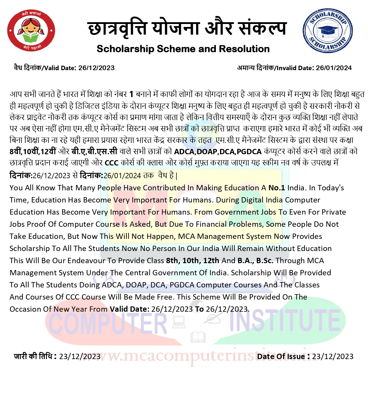 किसी भी सेंटर पर आप छात्रवृत्ति को लेकर भरोसा ना कीजिए जब तक कोई सेंटर आपको यकीन ना दिला दें कि वह आपको छात्रवृत्ति 100% प्रतिशत देंगे तब तक आप उनके यहां किसी भी प्रकार का फॉर्म ना भरें अगर वह आपको छात्रवृत्ति प्राप्त कराते हैं तो वह आपको उसका पूरा प्रमाण देंगे अगर वह ऐसा नहीं करते हैं तो आप उस इंस्टिट्यूट पर दाखिला ना ले एम.सी.ए इंस्टिट्यूट मैनेजमेंट सिस्टम केवल अपनी ब्रांच पर छात्रवृत्ति छात्रों को प्राप्त कराने की अनुमति देता है तो कृपया पहले अच्छे से जांच लें उसके बाद कदम बढ़ाए